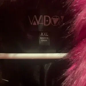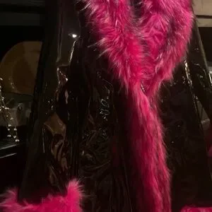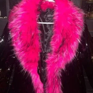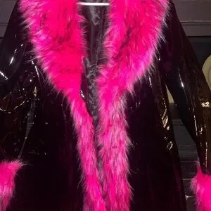This is a Dolls Kill Widow vinyl faux fur coat in black with hot pink trim.