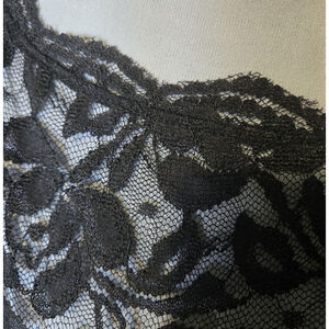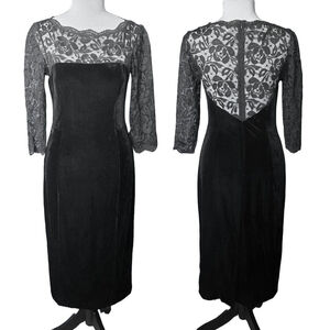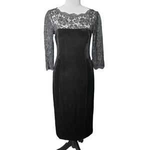 Features: Lace overlay, velvet trim, fitted sheath silhouette, back zip, knee-to-midi length