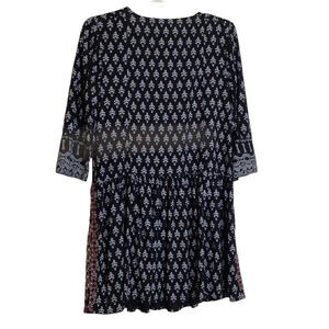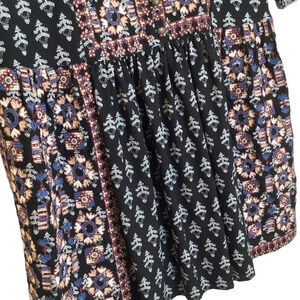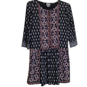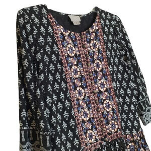 Mixed media prints. Multi-color embroidery. Drop waist/peplum style Decorative metal buttons in front. 3/4 length sleeves. Very good preowned condition.