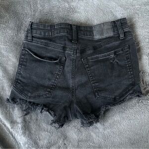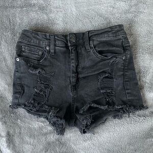 These black jean shorts from Aeropostale feature a heavily distressed design with a raw, frayed hem for a trendy, worn look. Crafted from classic denim, they offer a stylish and edgy addition to any casual outfit.