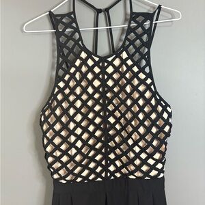 Marineblu, Small, black pant suit, wide leg, nude top with black lattice pattern