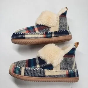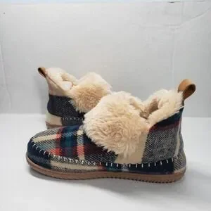 Cream plaid bootie house slippers, women's size 9. Dearfoams Alpine Energy Return style with a cozy multicolor navy plaid in shades of blue, red, and cream. Lined with plush cream faux fur that spills over the collar for added warmth and style. Features removable, shock-absorbing contoured insoles, lightweight textured rubber indoor/outdoor soles, a heel pull tab, and decorative whipstitch detailing for a touch of rustic charm.