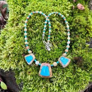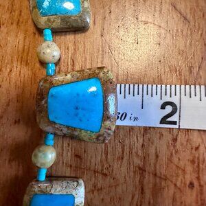 Construction: Hand-strung natural stone beads with three turquoise focal stones