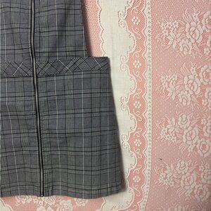 Plaid Zip-Front Pinafore Dress Black & white plaid jumper dress with adjustable straps and silver ring zipper. Size 14 Waist 18.5” | Length 31.5” (adjustable) 98% cotton / 2% spandex Stock: D-018