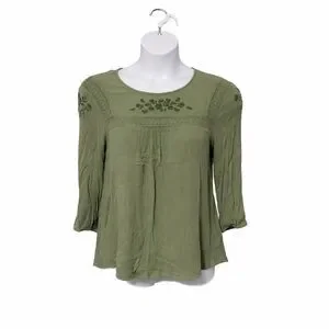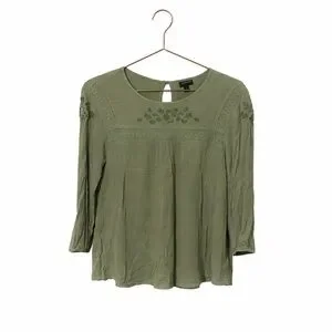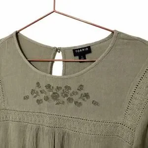 Effortlessly flowy with beautiful detail, this Torrid boho top features soft olive green fabric with delicate embroidery across the chest and shoulders for that relaxed, free-spirited look.
