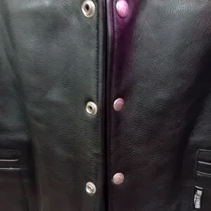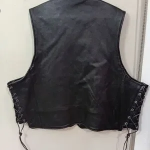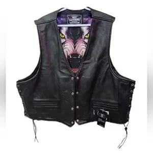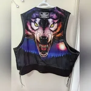 Black leather vest with a fierce wolf design inside. Features button closure and side laces.