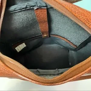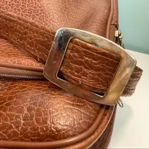PVC sponge leather has adjustable strap. Zippers work perfectly and in good overall shape. Please refer to last photos for a couple areas of imperfection.
