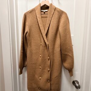 Chic and cozy sweater dress from Anthropologie in a warm camel brown tone. Features a flattering double-breasted button design with a soft shawl collar and relaxed long sleeves. Ribbed knit texture with a tailored yet comfortable silhouette that’s perfect for cooler weather.