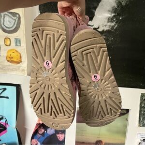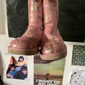 women’s UGG boots! pink with gold flecks and pink sherpa lining. these are awesome as hell and rare! used, in good condition with slight overall wear and a few pits on sides, as pictured. no other damage or matting on the sherpa lining. size women’s 9. california vibes, feminine, bohemian, boho, festival, lana del ray, etc :) message me with questions or offers!