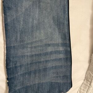Navy and White striped pattern with iconic interlocking Chanel Cs . Backed with denim fabric. Top zipper.