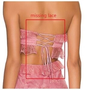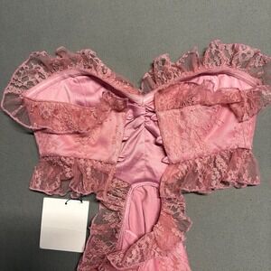 Keywords: Majorelle dress, pink lace dress, strapless maxi dress, cutout dress, ruffle dress, asymmetrical hem dress, lace up back dress, formal dress, party dress, bohemian dress, romantic dress, special occasion dress, designer dress, summer dress