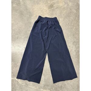 The Lululemon Wanderer Culotte in True Navy is a versatile pair of women's pants in size 2. Made from Swift fabric, these wide-leg pants feature a pull-on closure, elastic waist, and multiple pockets for convenience. With a solid blue color and a regular fit, these pants are suitable for various occasions including travel, activewear, casual, workwear, and business. The lightweight and breathable design, along with moisture-wicking properties, make them ideal for activities such as walking, hiking, and yoga. Ideal for all seasons, these pants offer comfort and style for everyday wear.