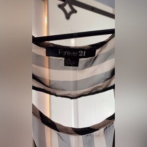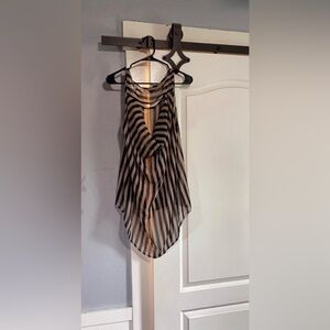 Chic high-low skirt with bold black and tan stripes. Ideal for versatile styling.