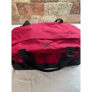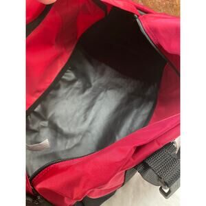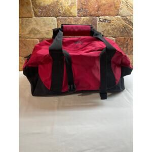 Durable and classic L.L.Bean duffle bag in a red and black colorblock design. Made from sturdy nylon with reinforced carry handles, making it great for gym use, sports, travel, or weekend trips.