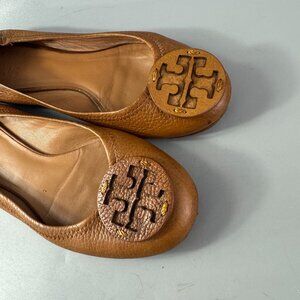 Tory Burch British Tan Leather Reva Flats Tumbled Leather Logo