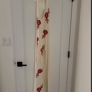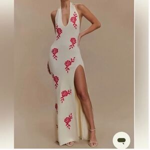 Meshki SHILOH Rose Knit Halter Maxi Dress. plunging neckline, halter design, adjustable tie, embroidered rose detail, leg slit, crafted from soft knit fabric