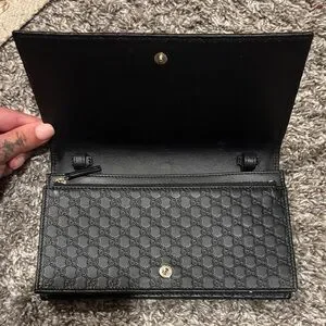 Elegant Gucci wallet with signature logo pattern. Classic black design. Brand new never used. Has space for a strap but I do not know where I left it. Cross body or hand bag.
