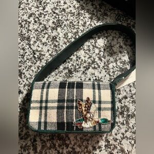 Anthropologie duck Fiona bag, this bag has never been worn but it was shipped to me with some puckering in the front plaid material and loose threads on the handle. Please review photos closely sold as is