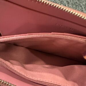 Chic Coach wallet in pink with yellow floral patterns. Stylish and functional for daily use.