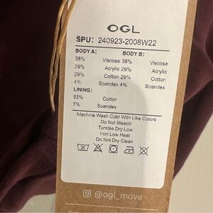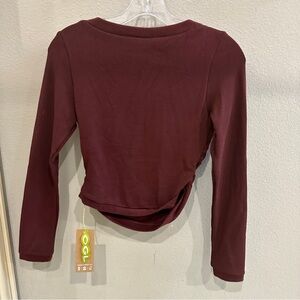 OGL Move long sleeve cropped top in a rich burgundy wine tone. Soft, stretchy performance knit with a sculpting fit and asymmetrical twisted hem detail at the waist. Lightweight yet substantial feel with smooth interior lining for comfort and support. Designed for movement, layering, or elevated athleisure styling. Crew neckline, long fitted sleeves, cropped silhouette with wrap-style front drape. New with original hang tag attached.