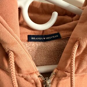 Brandy Melville zip up hoodie in a soft dusty rose pink color. Full zip front with drawstrings, kangaroo pockets, and a cozy fleece interior.