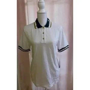 Natty Golf Polo Shirt white with gold and green metallic embellished golf club and flag design on the collar. The collar and sleeve trim is detailed with gold lurex sparkly thread. Women's Small NWT