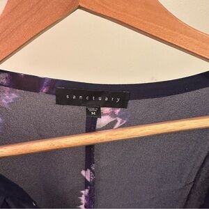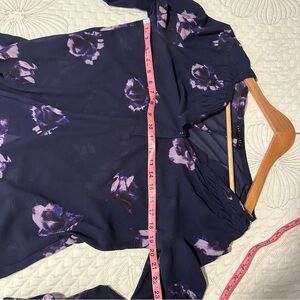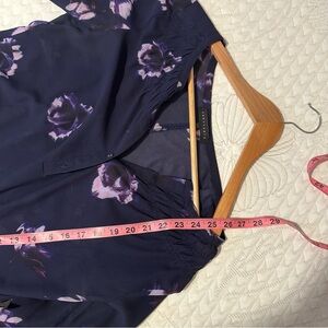 Chic blouse with navy base and purple floral design. Boxy design with split back detail. Unlined, sheer top. Ideal for versatile styling.
