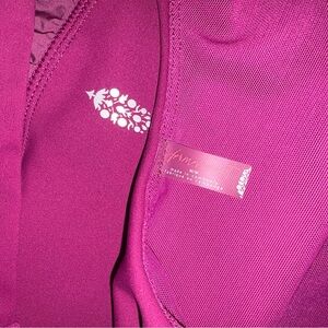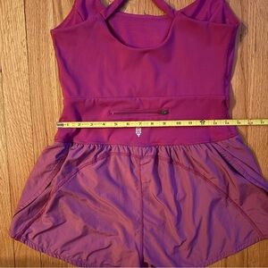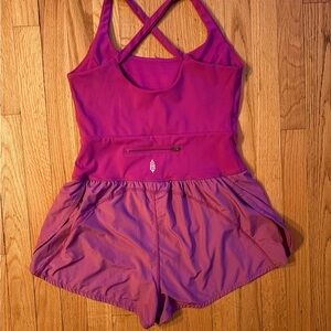 Athletic romper featuring a magenta hue with a flattering cutout detail on the bodice. Crossover straps on the back and a zippered pocket at the waist. The shorts component is a contrasting lighter magenta with a flowy, gathered hem. Built-in shorts provide comfort and coverage.