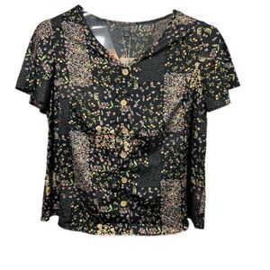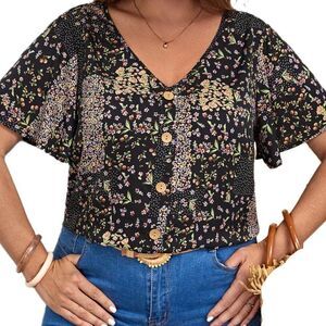 Brand new with tags ditsy floral button‑front blouse in black with pink, white, green, and lavender accents. Features a flattering V‑neckline, soft flounce short sleeves, and a lightweight, flowy drape. Perfect for work, brunch, layering, or everyday feminine style. Emery Rose by Shein.