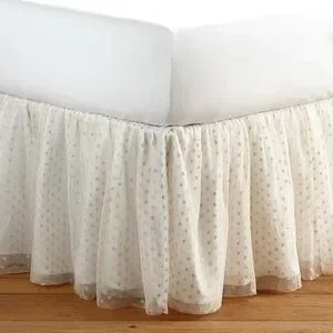 Elegant bed skirt with white and gold polka dots. Perfect for adding a touch of style to your bedroom.