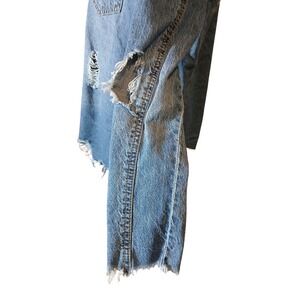 Distressed denim shirt jacket in a medium wash blue. This versatile piece features heavy distressing throughout, including ripped details on the front, back, and sleeves, along with a raw, frayed hemline for a rugged, lived-in look. Designed with a classic button-down front, point collar, and two chest flap pockets, it offers a relaxed, oversized silhouette that works perfectly as a layering piece or a standalone top.