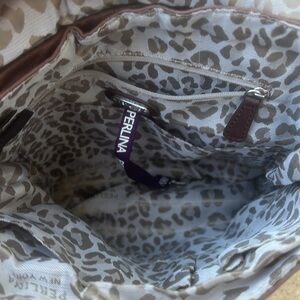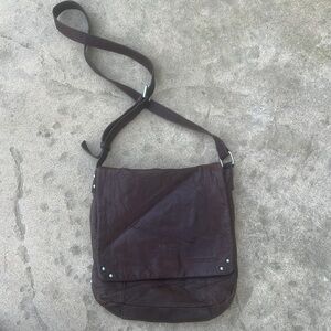 PERLINA New York Brown Distressed Leather Crossbody Purse. Adjustable strap, brushed silver hardware, magnetic closure.