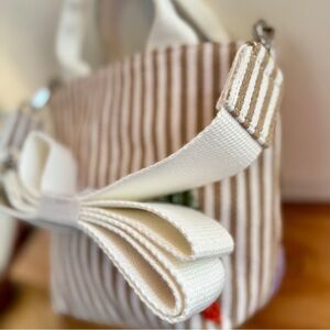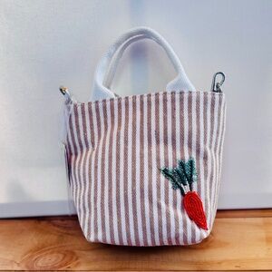 New, boutique-style hand-beaded mini tote bag featuring an adorable vegetable motif with carrots, peppers, onions, and fresh produce details. Set against a neutral striped fabric, this bag gives effortless Anthropologie-inspired, slow-fashion energy—perfect for farmers markets, brunch dates, or styled as a statement accessory.