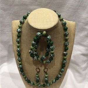 Beautiful Handmade Green Speckled Round Beaded Necklace Bracelet & Earring set perfect for any occasion. A date, a party, a wedding, work, a night out with friends, or a concert. Stand out in any setting with this handmade jewelry set.