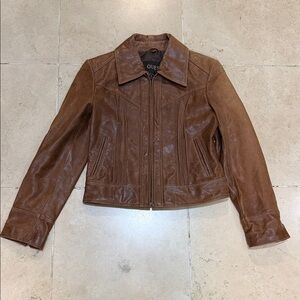 Stylish Guess leather jacket in tan. Perfect for versatile wear. Classic design with a modern touch.