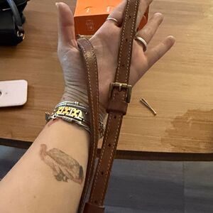 Stylish Louis Vuitton crossbody bag with iconic monogram pattern. Features a brown leather strap and gold hardware.