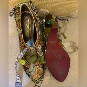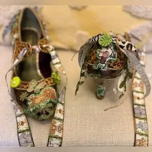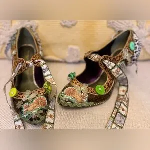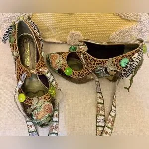 Unique, custom, one~of~a~kind women's Mary Jane style pump with unique wedge heel and featuring a zoo/jungle/safari them with LOTS of embellishments in green and browns. Perfect for adding a touch of creativity to any outfit.