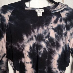 This stylish tie-dye hoodie from features a striking black and light pink cropped design. Cute silver metallic thread down sleeve. Perfect for adding a trendy touch to your child's wardrobe.