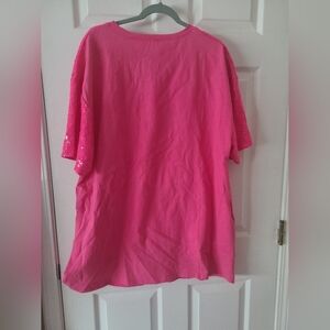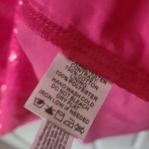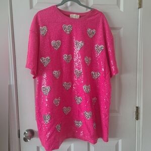 Vibrant pink mini dress. Silver sequin heart accents. Perfect for a fun night out.