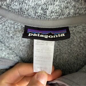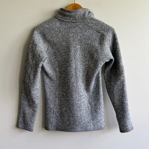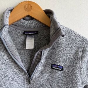 Patagonia Better Sweater quarter zip fleece in heather gray. Soft knit fleece with stand collar, quarter zip front, and zippered sleeve pocket. Classic slim, feminine cut typical of the Better Sweater line. Warm yet lightweight, suitable for layering or everyday wear. Fabric tag indicates polyester fleece construction. Overall very good condition with no visible holes, stains, or functional issues.