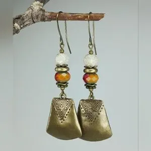 HAND CRAFTED Beaded Tribal Brass Dangle Earrings Red Orange Boho Rustic
