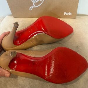 Neutral/tan color, patent leather, Authentic Louboutin heels.