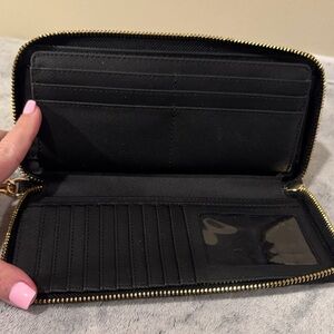 Black pebbled leather wristlet wallet by Michael Kors. Features gold-tone logo and zipper. Perfect for everyday or travel.