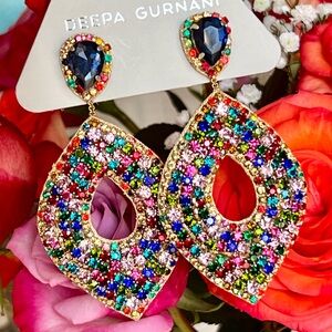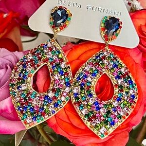 Make an entrance in these gorgeous luxe hoop chandeliers embellished with luminous blue crystals on top & shimmering multicolor crystals below, by jewelry designer Deepa Gurnani whose work is often featured by Anthropologie. Incredibly beautiful opulent showstoppers, perfect for special occasions, parties & evening wear, or just to show off your favorite top & jeans. Elegant, lightweight & guaranteed to bring raves whenever you wear them. Designed by Deepa & handmade according to her specifications by jewelry artisans in India, with delicate glass crystals, resin crystals, suede backing & post backs. Approximately 3 1/2β long, 1 3/4β wide. The model photos at the end are for showing the style only. NWT π·
