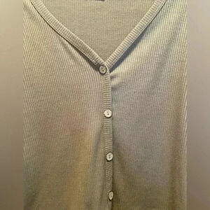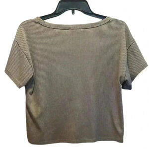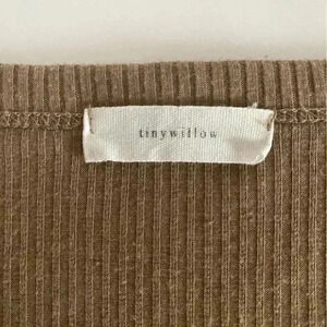 Tiny Willow Rib knit top. V-neck with faux button front. Short sleeve. Size and fiber content tags missing. Measurements laying flat: Armpit to Armpit 19”. Shoulder to hem 18.25”. Hem 18.25”. Sleeve 4.5”. Pet free smoke free environment.