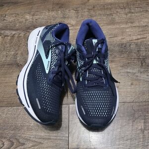 Gently used Brooks ghost sneaker. Good condition and quality. Comfortable and durable. Minor wears but in good shape. Stylish navy running shoes with light blue accents. Perfect for athletic activities. Women's size 9.5.