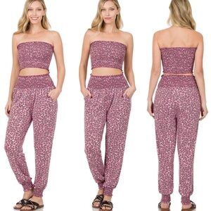 Stylish pink leopard print jumpsuit. Strapless top with elastic waist. Comfortable and trendy design.
