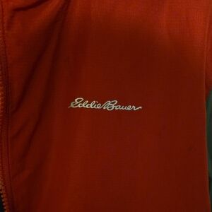Vibrant red and gray jacket with camouflage lining. Features a hood and zip closure.