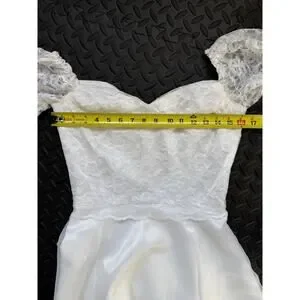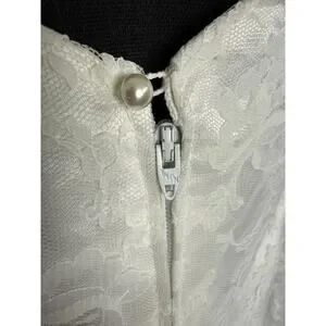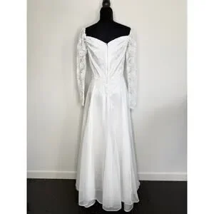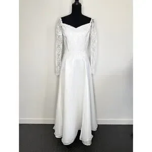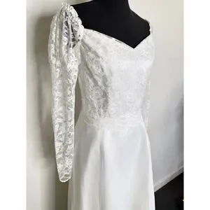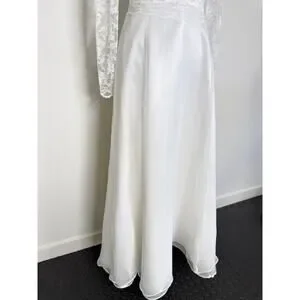 This late 80s–early 90s wedding dress features a structured, figure-shaping bodice with boning at the sides, delicate floral lace overlay, and elegant sheer lace sleeves. The satin skirt flows into a soft A-line silhouette that moves beautifully and photographs like a dream.