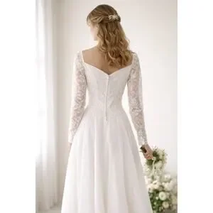 This is that classic, modest-but-romantic bridal look modern brides love — perfect for traditional weddings, elopements, courthouse ceremonies, or vintage-inspired shoots.